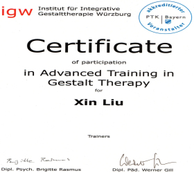 受訓經歷:中德完形治療連續培訓項目、現代行為治療系列培訓項目、中美新認知行為治療連續培訓項目、依戀理論實踐與研究連續培訓項目、中國挪威精神分析治療師與督導師連續培訓項目、加拿大游戲治療連續培訓項目、身心醫學中的正念減壓專業培訓證書,師從人類依戀方面的國際領軍人物Patricia M.Crittenden博士。
